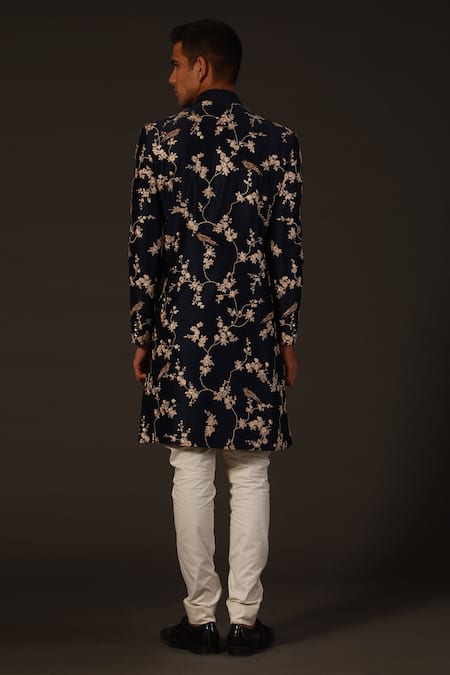 Indigo silk lined sherwani with floral & bird embroidered motifs, front buttons & mandarin collar.