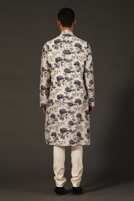 Ivory kurta with floral printed motifs & stitch line embroidery. Paired with churidar.