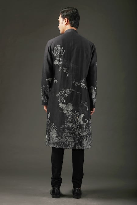 Black shibori printed chanderi silk kurta in floral & animal motifs. Paired with cotton churidar.