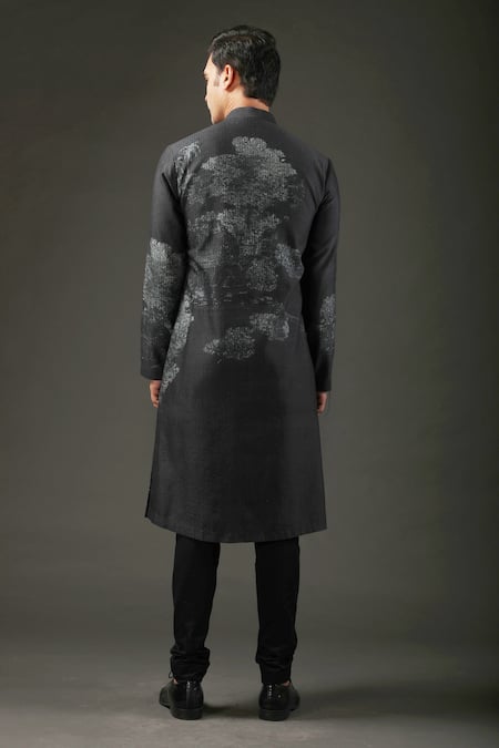 Black shibori printed & resham work chanderi silk kurta in floral & Mughal motifs. Paired with cotton churidar.