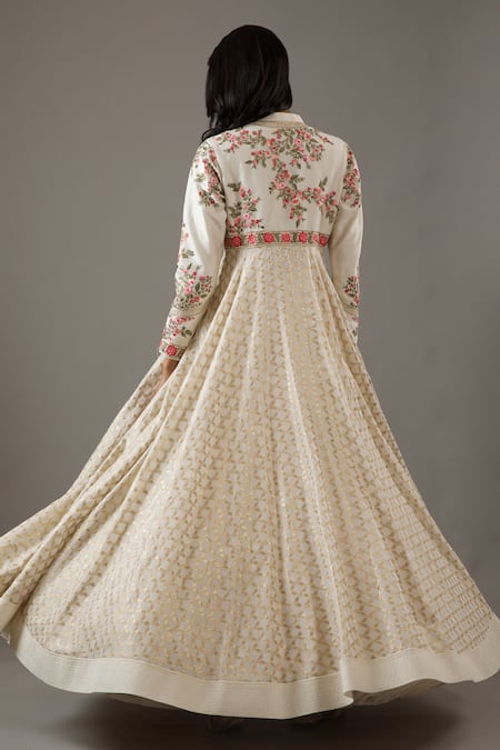Ivory long sleeves Anarkali featuring mandarin collar and dahlia bloom flora embroidery. Paired with churidar and a seer sucker detail dupatta.