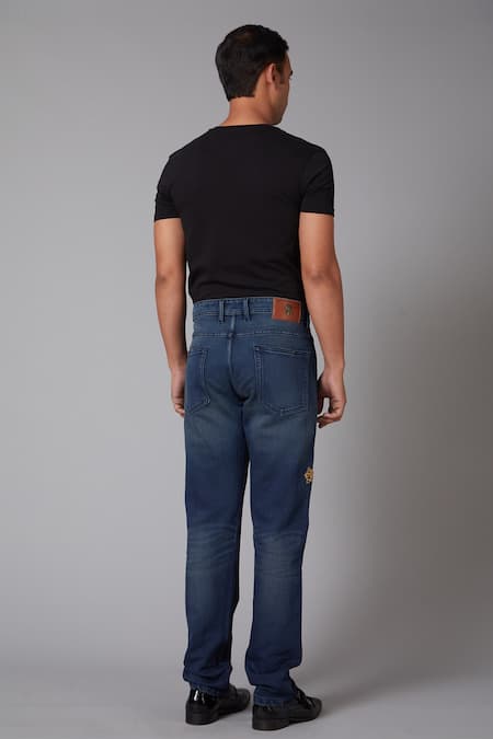 Dark blue regular fitted denim jeans with placement crown embroidery.