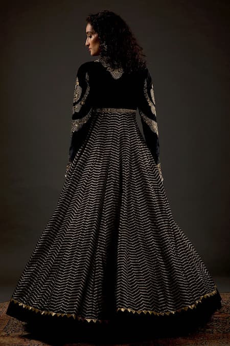 Black chevron pattern anarkali with floral embroidered motifs, silk velvet bodice & mandarin neckline. Paired with churidar & dupatta.