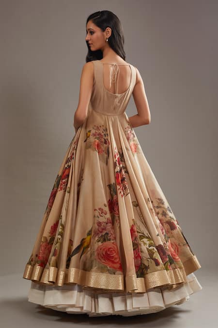Beige anarkali featuring printed floral garden motifs with a fit & flare silhouette. Paired with churidar and a coordinating dupatta.