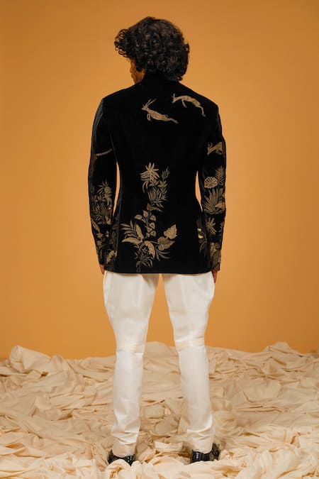 Black velvet bandhgala featuring resham thread embroidery in a jungle placement pattern