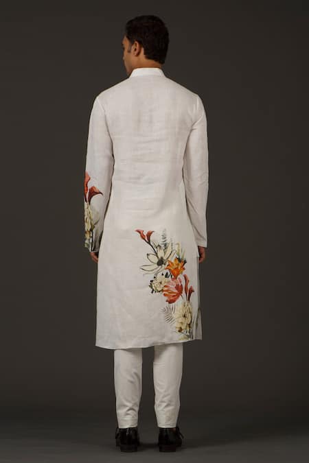 Ivory kurta with floral printed motifs, mandarin collar & front buttons. Paired with cotton churidar.