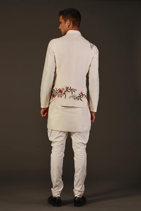 Ivory silk lined matka silk bundi with front buttons, patch pocket & placement floral embroidery.