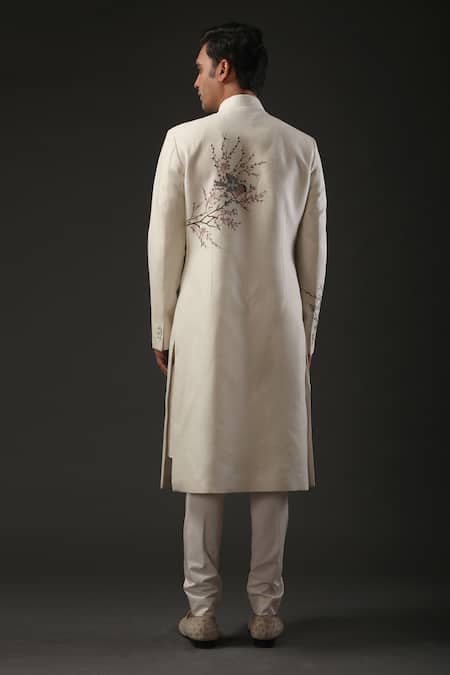 Ivory matka silk sherwani with resham & zari embroidery in floral, bird motifs & silk lined.