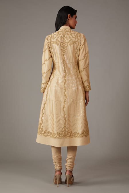 Beige kalidar kurta featuring all-over embroidered floral vine motifs and a front keyhole closure. Paired with matching churidar and dupatta in net fabric.