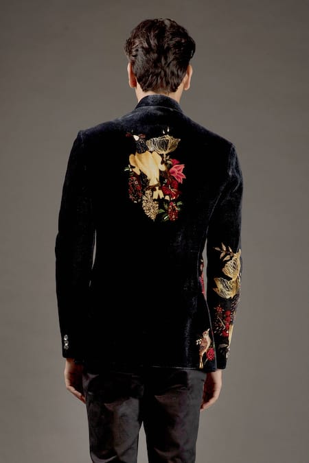 Black printed silk velvet bandhgala with silk lining with highlighted sequins embroidery.