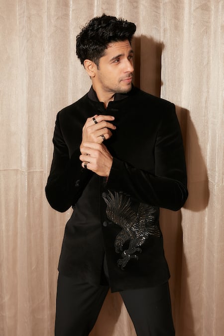 Black bandhgala in silk velvet base with bird motif placement embroidery.