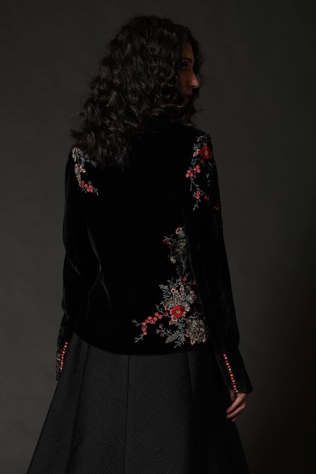 Black short silk velvet jacket with floral embroidered motifs & mandarin collar.