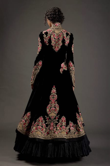 Black silk velvet long jacket with floral resham thread embroidery and hand work.