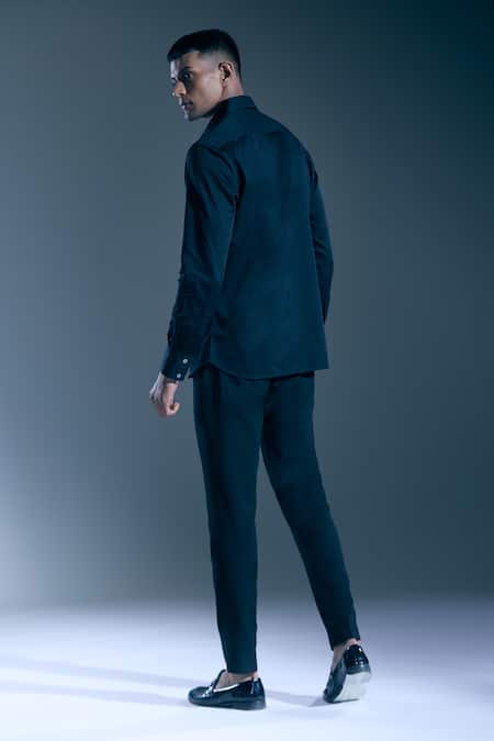 Black shirt featuring a collar neckline with tonal sequin and tree branch motif embroidery