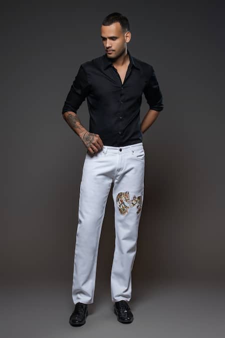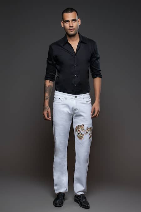 Off-white jeans featuring intricate zari thread and resham embroidery in a two horse placement design