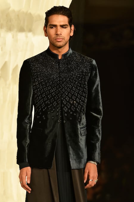 Green Silk Velvet Embroidered Metallic Beads Astragal Bandhgala