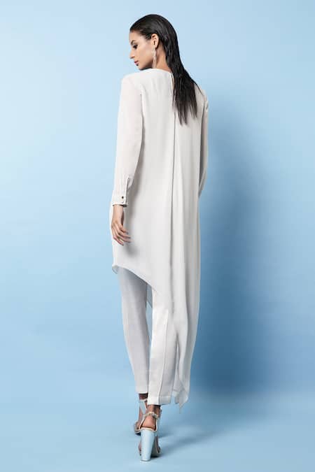 Silver and white asymmetric top featuring full sleeves and metallic embellishments