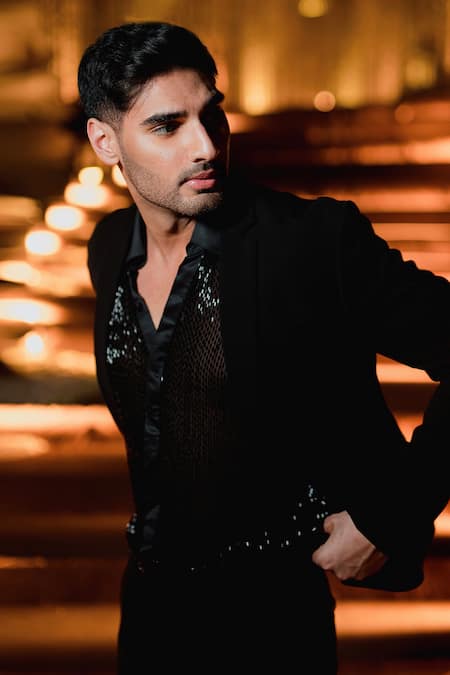 Buy_Rohit Gandhi + Rahul Khanna_Blue Crepe, Net Sequins Jacket Set With Shirt _Online_at_Aza_Fashions