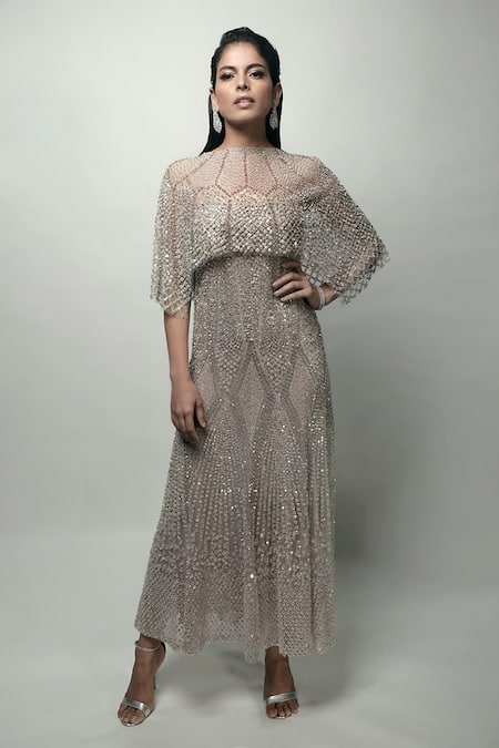 Beige A-line dress featuring geometric pattern embellishments with sequins and crystal beads. Paired with a flared cape that has a straight neckline.