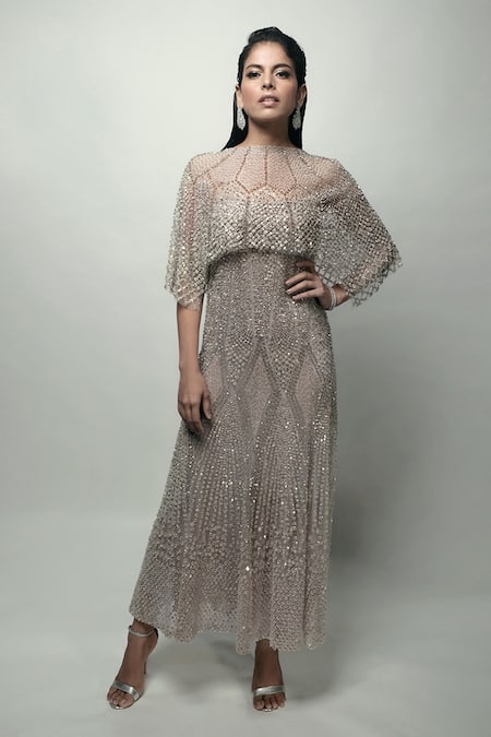 Channelled artwork pattern with tonal sequins, Asymmetric hem design, Fully embellished with various bead types
