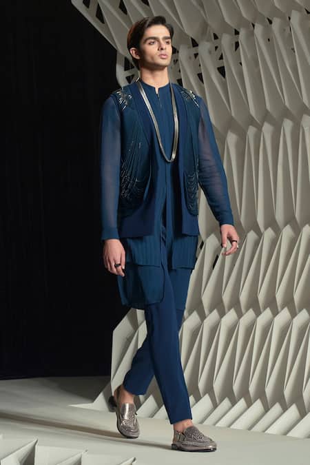 Teal blue double layered kurta featuring a mandarin collar and sheer sleeves