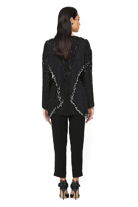 Buy_Rohit Gandhi + Rahul Khanna_Black Satin Fringe V-neck Full Sleeve Jacket _Online_at_Aza_Fashions