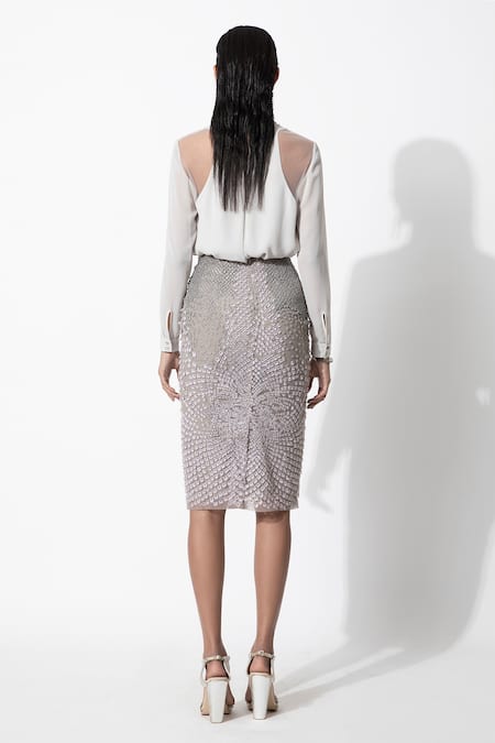 Silver georgette top featuring full sleeves, V neck, and tonal applique work with cutout detailing. Paired with an embroidered skirt adorned with metallic sequins embellishments.