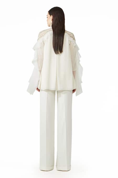 Off White Organza Embroidery Collared Hand Crafted Swing Shirt