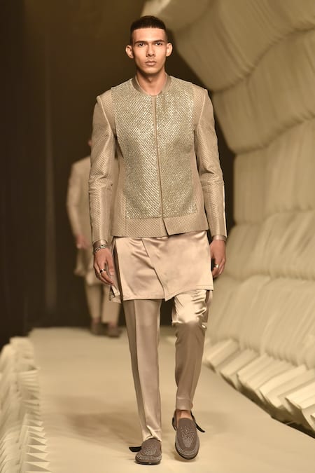 Grey satin wrap around kurta featuring a deep V neck and full sleeves