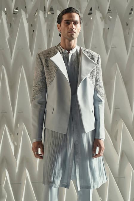 Ice blue kurta featuring pintuck detailing and a pearl embroidered bodice