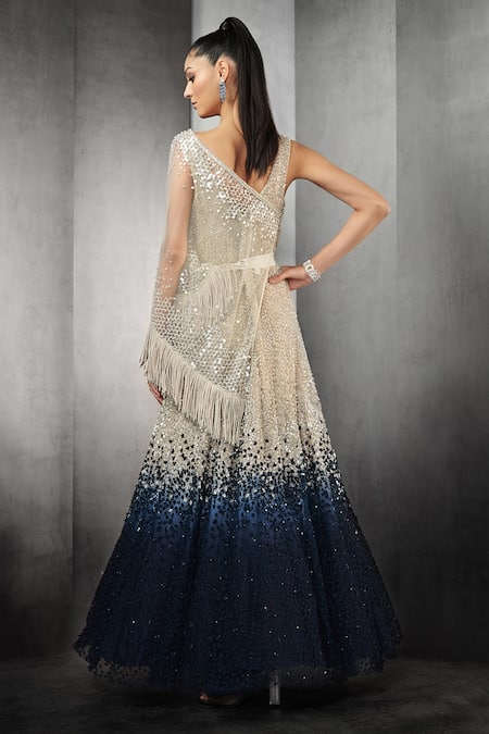 Mist to sapphire ombre handcrafted gown with tonal sequin embellishment and organza fray detail. Comes with embellished fringe cape and belt.