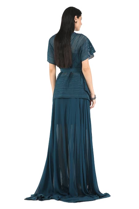 Buy_Rohit Gandhi + Rahul Khanna_Blue Silk, Georgette V-neck Panelled Box Top _Online_at_Aza_Fashions