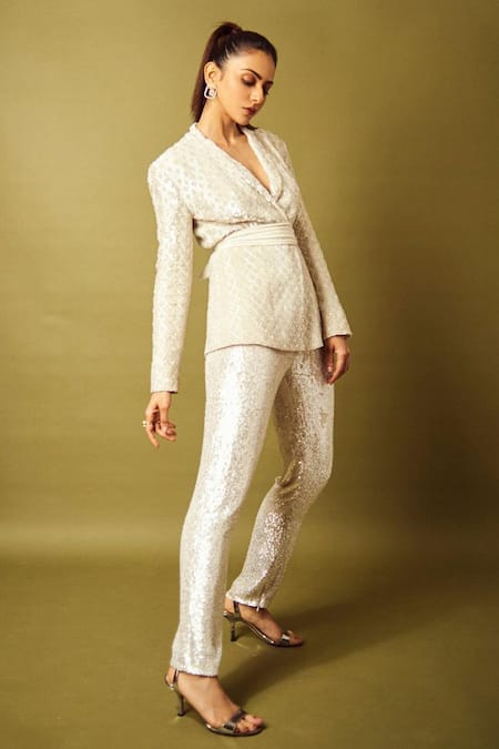 White heavy embellished sequined double-breasted jacket featuring a lapel neckline and straight full sleeves. Paired with matching trousers crafted from silk georgette.
