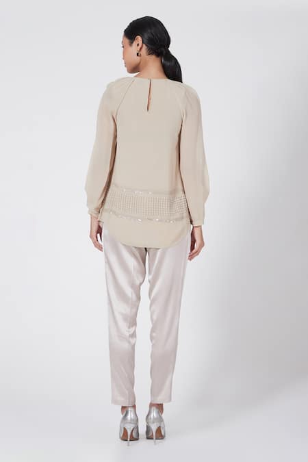 Beige full sleeve swing top featuring an embellished hem with sequins