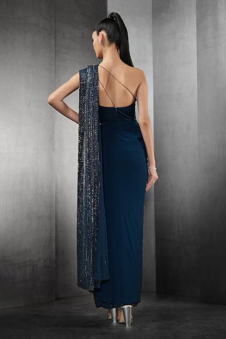 Blue Georgette Sequins One Shoulder Embellished Saree Gown