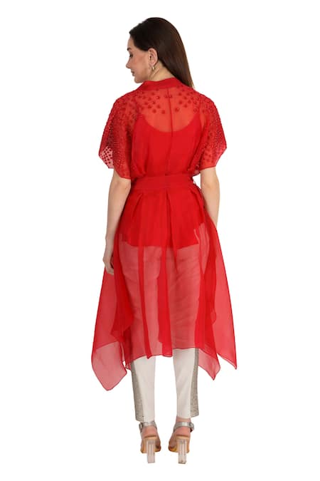 Red Organza Embroidery Applique Notched Lapel Collar Sleeve Long Top With Belt