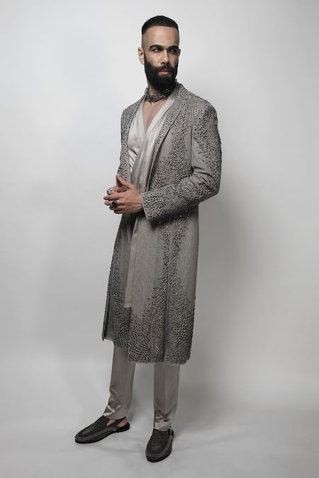 Grey satin straight fit trouser featuring a broad waistband adorned with satin piping and two-buttoned closure with loops and adjustment fasteners