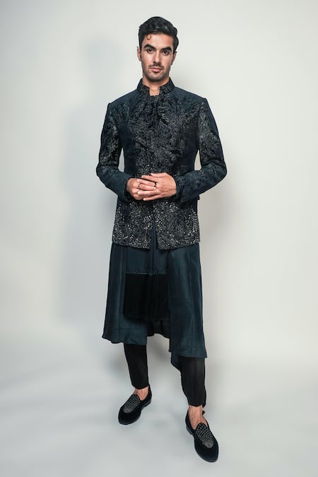 Imperial teal bandhgala featuring full metallic embroidery highlighted with crystals at the bottom