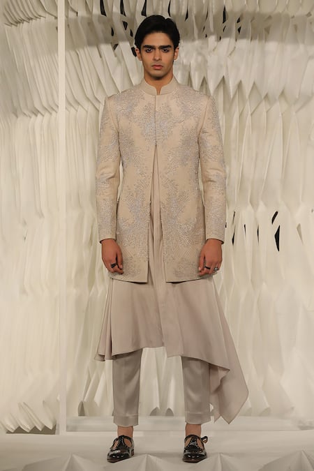 Beige Silk Pearls, Crystals Yemeni Embellished Sherwani