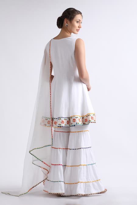 White anarkali featuring geometric resham and gota embroidery on the border. Paired with a tiered sharara and contrast bordered sheer dupatta.