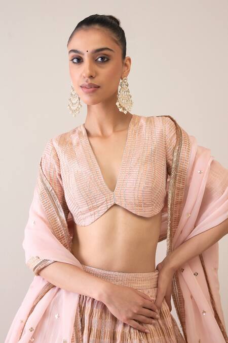 Peach lehenga featuring hand embroidery with gota and sequins. Paired with a padded blouse and a silk organza dupatta.