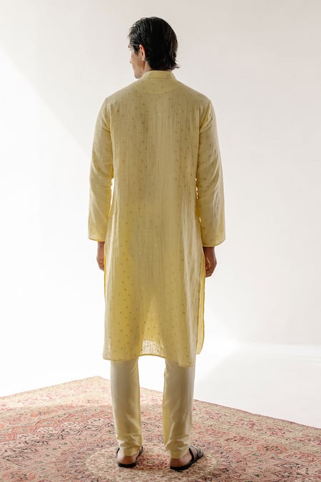 Yellow kurta featuring golden floral accents and a potli detailed placket. Paired with coordinating yellow pant for a complete look.