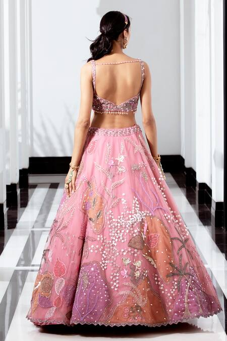 French rose hued lehenga with multicolour applique patchwork, with shell sequins. Paired with embroidered blouse & a ruffle dupatta.