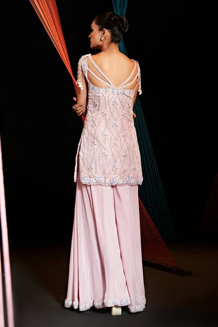 Pink Net, Organza Embroidery, Pearls, Sequins Keyhole Floral Kurta Sharara Set