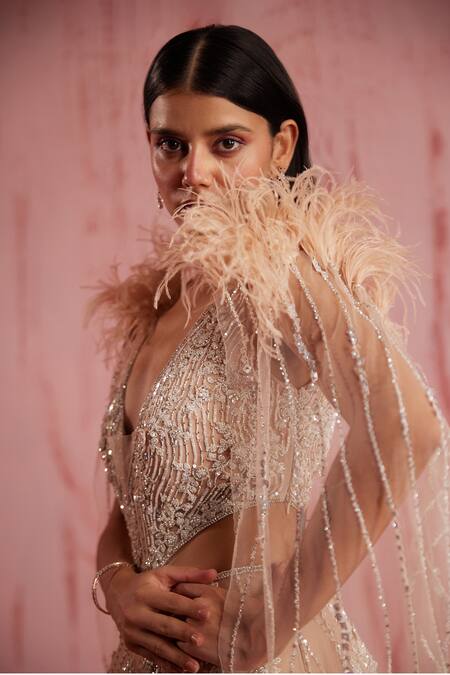 Peach gown featuring a plunge V-neckline and floral jaal embroidered motifs. Comes with detachable cape style shoulder draped panels embellished with sequins and feathers.