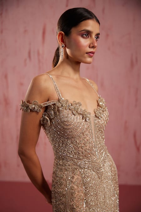 Floral applique embellished shoulder straps, Sequin and crystal embellished scallop motifs
