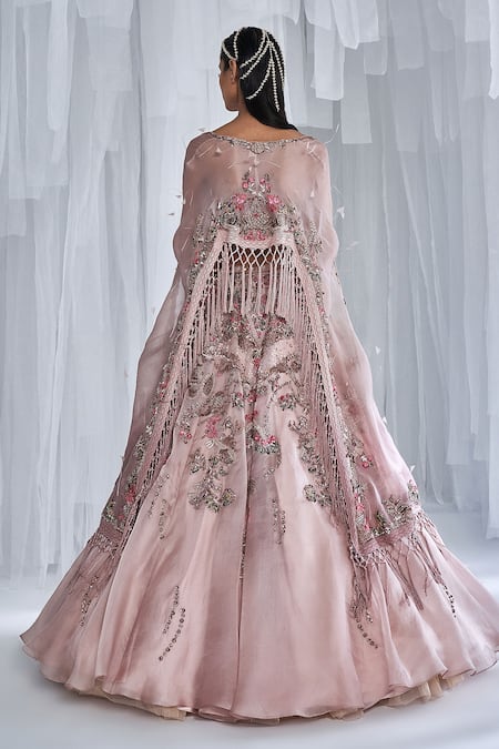 Dolly J_Pink Organza, Lace Sequins, Rosalie Cape Zardozi And Embroidered Lehenga Set _Online_at_Aza_Fashions