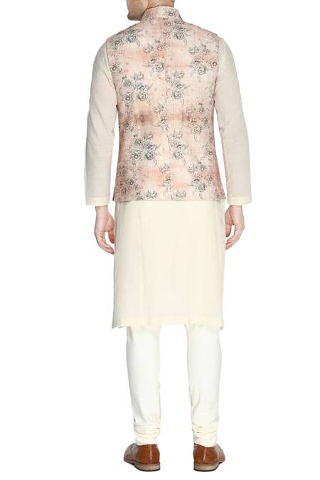 Pink Bundi with floral printed motifs all over paired with kurta & pants.