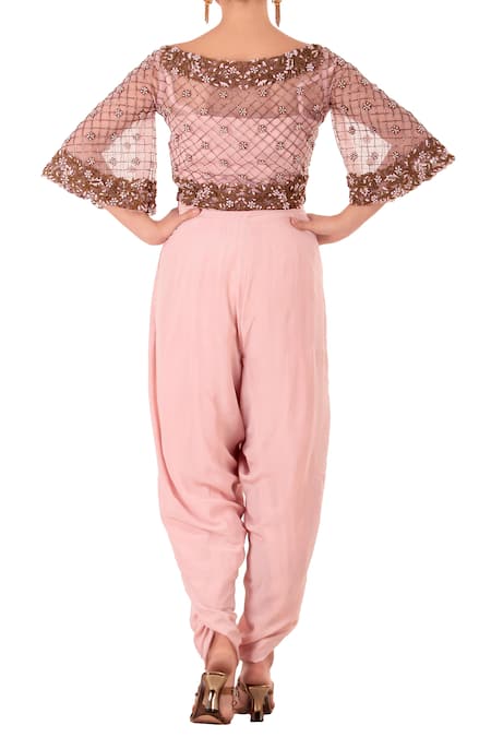 Pink Crepe, Net Embroidery Jumpsuit With Embellished Cape Top