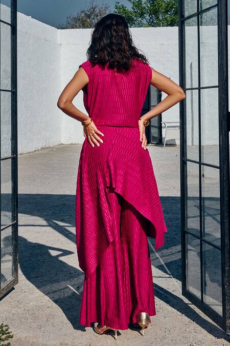 Buy_House Of Fett_Magenta Embroidery Round Neck Rosso Pleated Asymmetric Top With Pant_Online_at_Aza_Fashions